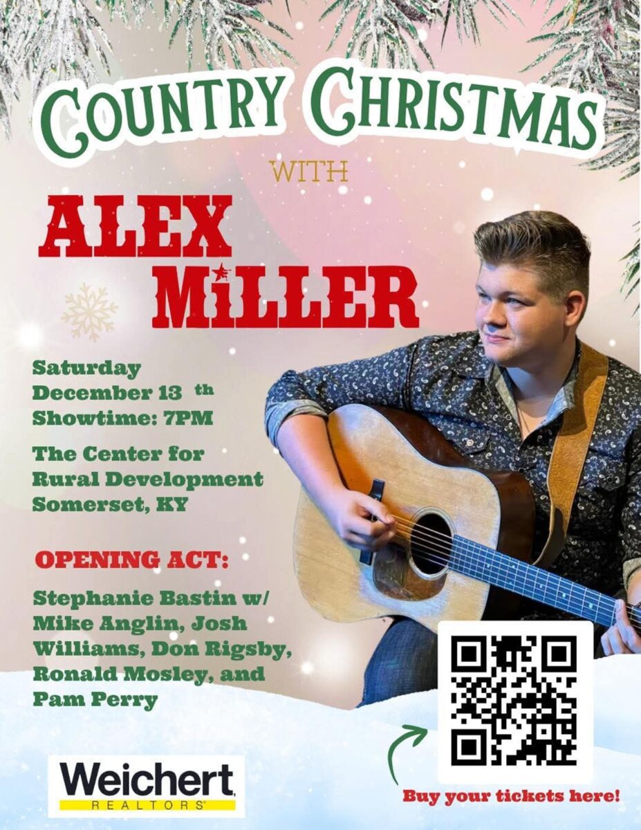 Country Christmas with Alex Miller & Friends – Center for Rural Development, 2292 S. Hwy 27, Somerset, KY, 7pm. Join us for a joyful night of music and celebration at Country Christmas The evening kicks off with a 30-minute Christmas set by Stephanie Bastin, with a bluegrass twist & talented musicians Mike Anglin, Josh Williams, Pam Perry, Don Grigsby, and Ronald Mosley. Then, Alex Miller and his band take the stage alongside Jeff Watson for country music sprinkled with festive Christmas favorites. Info and tickets 606-677-6000 or www.centertech.com.