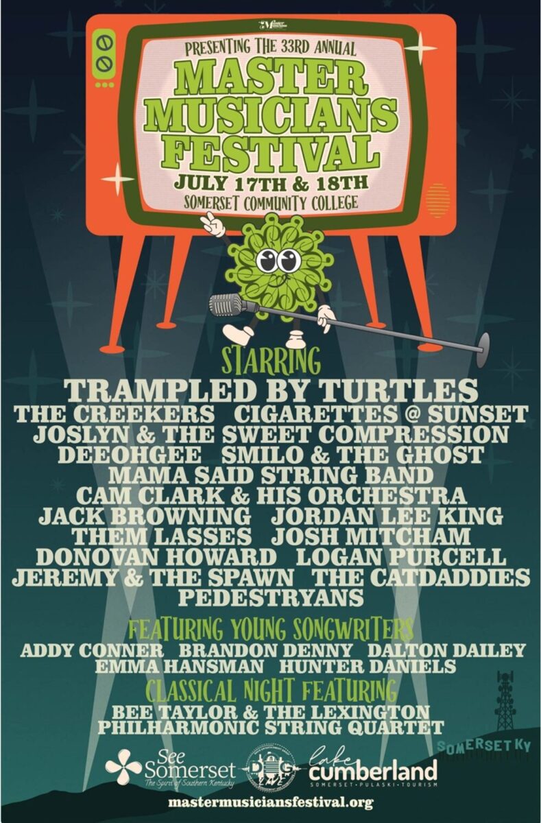 Master Musicians Festival 2026 – SCC, Festival Field, 808 Monticello St. Somerset, KY, 4-11pm Friday; 11am-11pm Saturday. Join the MMF staff for the 33rd Annual Master Musicians Festival! The 2026 lineup features Trampled By Turtles, The Creekers and includes Cigarettes @ Sunset, Joslyn & The Sweet Compression, Deeohgee, Mama Said String Band, Cam Clark & His Orchestra, Them Lasses, Jeremy & The Spawn, The Catdaddies and more. Young songwriters include Andy Conner, Brandon Denny, Dalton Dailey, Emma Hansman and Hunter Daniels. Info call 606-875-6732 or visit www.mastermusiciansfestival.org or www.facebook.com/mastermusicfest/ for tickets & a daily lineup.